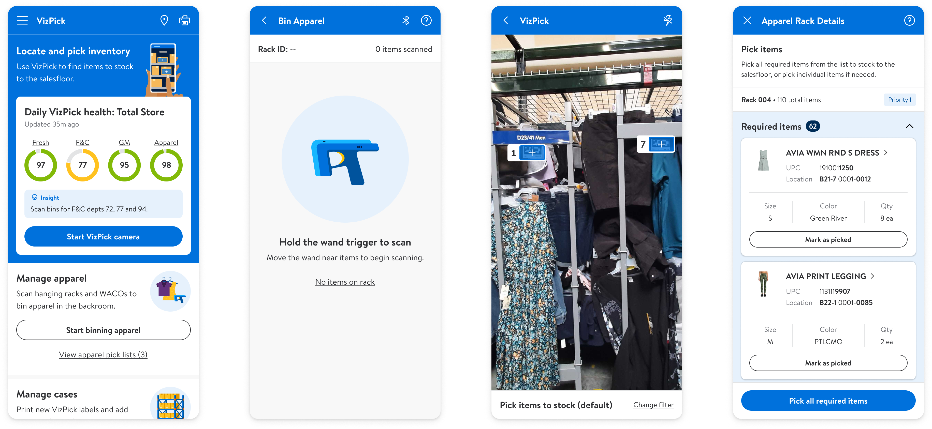 I started by visiting a few stores to see how the apparel team was performing the weekly RFID inventory counts and how other departments were using VizPick. While iterating on concepts, my team and I continued visiting stores to gather feedback and validate design decisions.