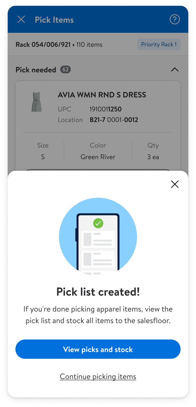 Once associates are done picking items, they are taken to the active pick lists, where picks from the apparel racks are sorted by sales floor aisle, so stocking can be done in the most efficient order. Once stocking is complete, associates are prompted to scan any apparel racks they worked on, to confirm what items were stocked.