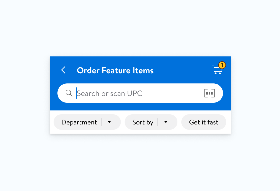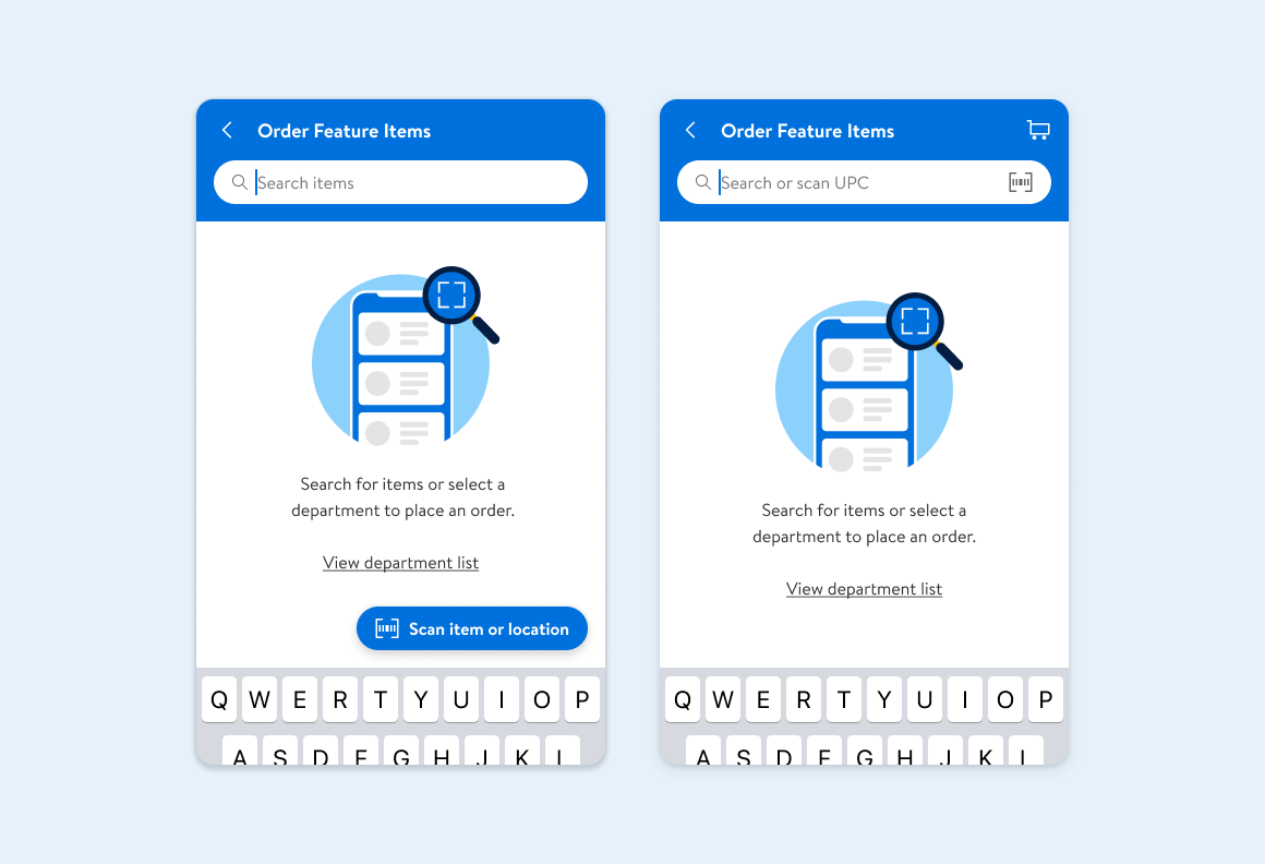 I explored entry points mirroring the Features app’s floating action button, or following the search bar pattern from the Walmart consumer app.